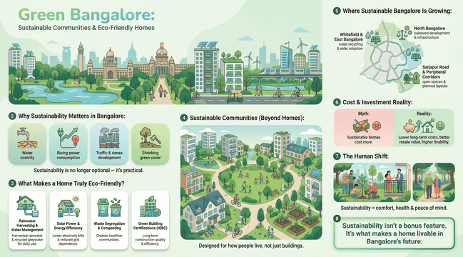 Newer developments in parts of East Bangalore, Sarjapur Road, and North Bangalore often include more sustainability-focused planning. These areas usually have better scope for water management systems, open spaces, and efficient layouts